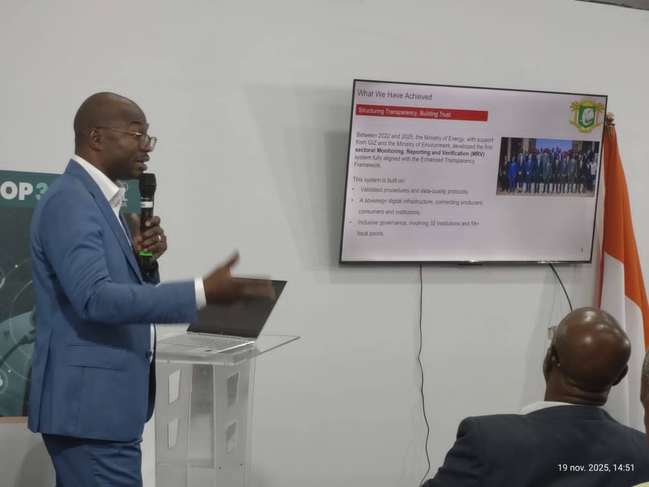 Pour garantir la crédibilité de ces investissements, la Côte d'Ivoire a mis en place un système de Mesure, Notification et Vérification (MNV), gage de transparence dans la mise en œuvre des actions. Cette session s’est déroulée le 19 novembre et a été porté par Monsieur Dosso Moussa, Directeur des Energies Renouvelables et la Bioénergie a présenté le modèle de transparence énergétique, conforme au cadre de transparence renforcé des Nations Unies.